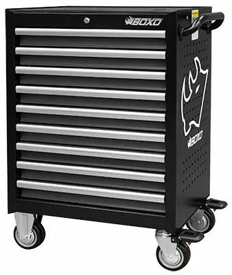 Erittäin tukevarakenteinen työkaluvaunu, jonka runko on valmistettu 1,0 mm paksuisesta teräslevystä. Yhdeksän kuulalaakeroitua vetolaatikkoa keskuslukituksella, laatikot pysyvät kiinni kahvassa olevan lukitussalvan avulla. Vaunun päällä luistamaton kumimatto. Vaunun päädyissä reikälevyseinät, joissa yleisimmin käytetty 9 x 38 mm reikäjako. Vetolaatikoiden mitat (L x S x K): - 569x397x72 mm Yhteen vetolaatikkoon mahtuu kolme Boxon BX-työkalumoduulia. - Yhden vetolaatikon kantavuus 40 kg - Vaunun kokonaiskantavuus 700 kg