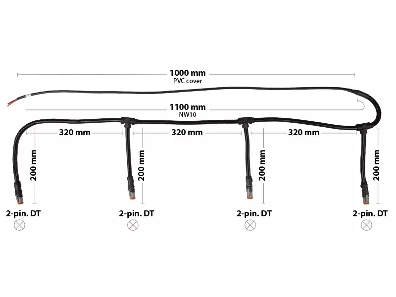 Kuvaus: Johtosarja neljällä Deutsch DT-2 liittimellä esimerkiksi työvalojen nopeaan asennukseen. Kaapelointi on suojattu suojaputkella joten se sopii erinomaisesti vaikeisiin olosuhteisiin, vaikka työkoneen katolla käytettäväksi.