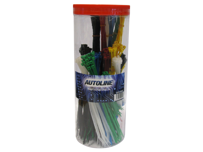 390kpl, muovipurkissa, 6 väriä: musta - valkoinen - sininen - vihreä - punainen - keltainen, 3 kokoa: 100x2.5mm (25kpl jokaista väriä) - 203x3.6mm (25kpl jokaista väriä) - 300x4.6mm (25kpl mustia ja valkoisia, 10kpl kutakin muuta väriä). valk /mus /sin /vih r/pun /kelt