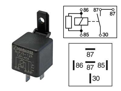 Tyyppi: 40A Jännite: 12V Tuotetieto: 5-nap, 40A, 2x87 ,vastuksella, kiinteällä muovipitimellä, 5 x 6.3mm liittimet Lisätieto: B-kytkentä